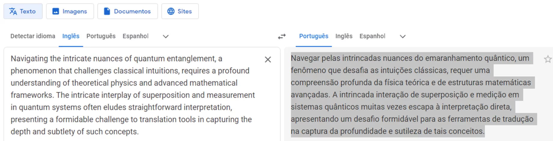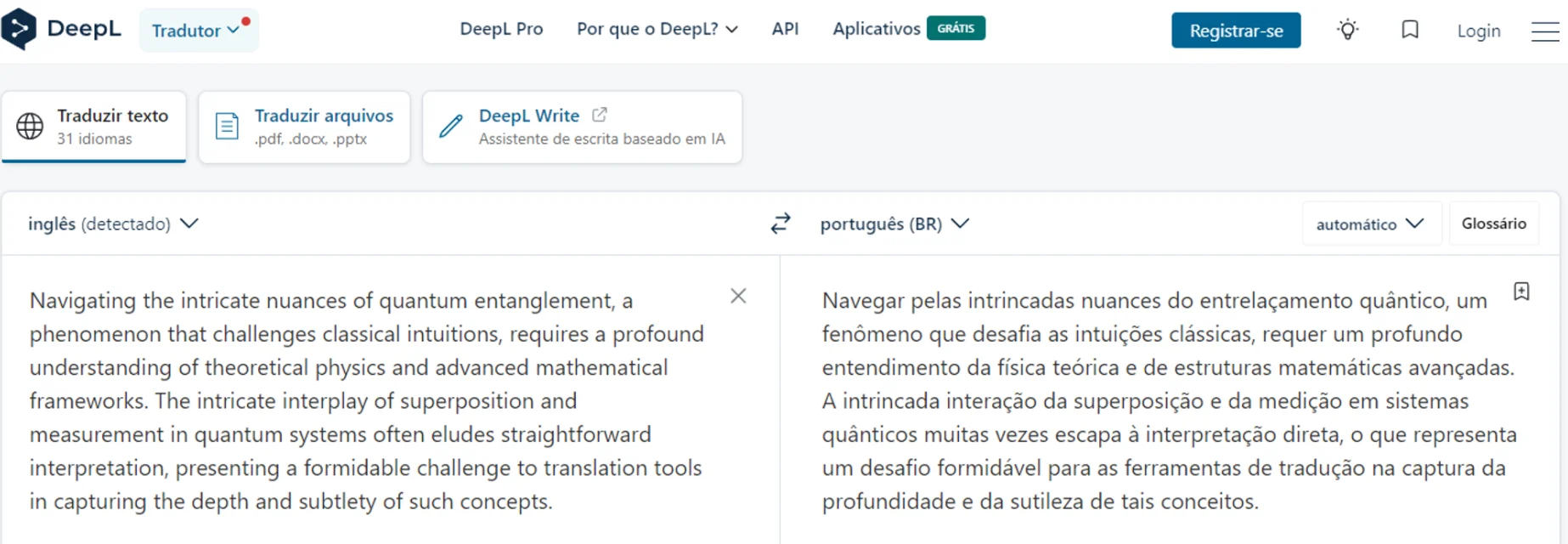 A tradução do DeepL é mais precisa, especialmente no termo “entrelaçamento quântico” ao invés de “emaranhamento quântico”, do google, além dos outros pequenos ajustes que fazem o texto mais agradável de ler. Portanto, a melhor tradução é a do DeepL